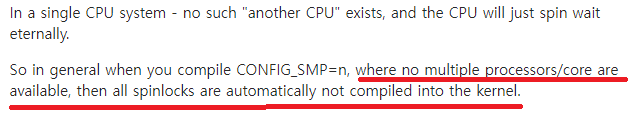 여기서 궁금한 점이 있는데 Single Core일 때는 Spin Lock을 쓰는게 과연 가능할까? 였다. 검색을 해보니 "Single Core일때 Spin Lock은 성능상 이득이 없다"라고 한다. 그런데 나는 성능상 이득이 아니라,