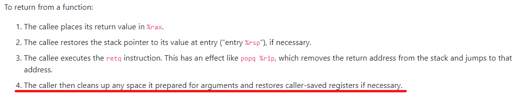 4. 위의 레지스터 표에서 볼 수 있었듯이, return value를 %rax 레지스터에 저장하고 있다. 그리고 스택 포인터를 저장하는 %rsp 레지스터를 더해서 스택에서 더 이상 필요없는 공간을 정리한다.