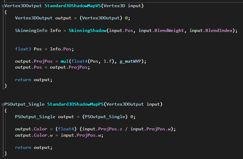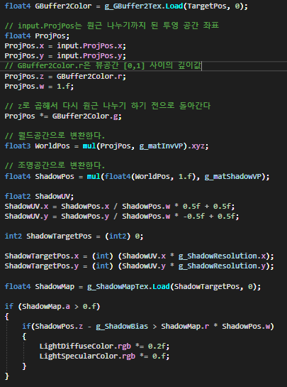 g_ShadowBias는 float같은 실수형 타입의 계산에서는 '==' 연산이 정밀도 이슈로 불안정하기 때문에 Bias를 둬서 Bias 범위 만큼의 허용 가능한 오차를 줘서, 현재 그리려는 픽셀의 깊이가 ShadowMap의 깊이 + 오차보다 크다면 그림자를 그리게 될 것이다.