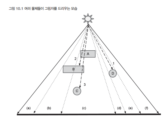 아래 그림 기준으로 1번 빛에서는 D앞에 가리는 물체가 없으므로 그림자가 생기지 않는다. 2번 빛은 B앞에 A라는 물체가 가리고 있으므로 2번 광선이 B의 표면에 만나는 지점에 그림자가 생길 것이다. C도 마찬가지로 A, B 물체에 가리니까 그림자가 생길 것이다. 단 중요한 것은 C의 표면에 그림자가 생기는 데에는 B 물체의 유무가 중요하지 않다. 이미 A의 존재만으로도 C와 3번 광선이 만나는 지점에서 그림자가 생길테니까.