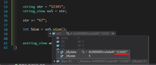 string_view는 문자열 포인터를 Data로 갖고 있으므로, sv5에 할당해준 원본 문자열 str을 수정하면 string_view의 Data도 같이 변한다. 그런데 Size는 초기에 할당해준 5가 그대로이다. 두 멤버가 불일치함으로써 문제가 생길 수 있다.