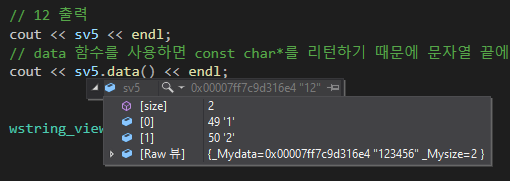 신기한 점은 sv5는 출력하면 예상했던대로 "12"만 출력되는데, sv5.data()를 출력하면 그대로 "123456"이 모두 출력된다. 디버그 모드로 sv5를 보면