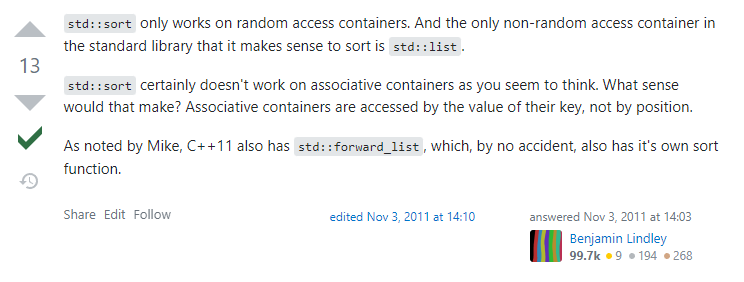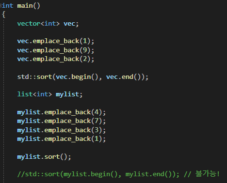std::vector는 std::sort로 정렬되지만 std::list처럼 전용 sort함수가 없다. 반대로 std::list는 전용 sort가 있지만 std::sort는 사용할 수 없다. 그러면 왜 std::list는 std::sort를 사용할 수 없을까 알아봤다