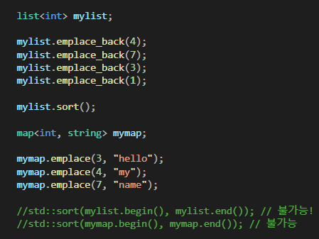 stackoverflow를 찾아보니 std::sort는 랜덤 엑서스가 가능한 std::vector나 std::deque만 사용 가능하다고 한다. 그래서 당연하게도 연관 컨테이너(Associative Container)에도 사용이 불가능하다