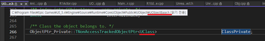 실제로 UObject 클래스 내부에는 UCLASS 객체를 멤버로 들고 있음을 엔진 코드에서 확인할 수 있다(UObject는 UObjectBase 클래스를 상속받는다고 한다)
