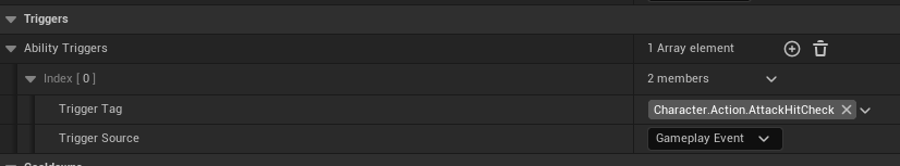 - 노티파이가 발생할때 GA를 활성화 하는 방법은 Ability Triggers 라는 세팅을 통해 가능하다. 이 세팅을 하면 노티파이에서 SendGameplayEventToActor 함수가 ASC에게 날려준 태그에 해당 GA가 반응한다
