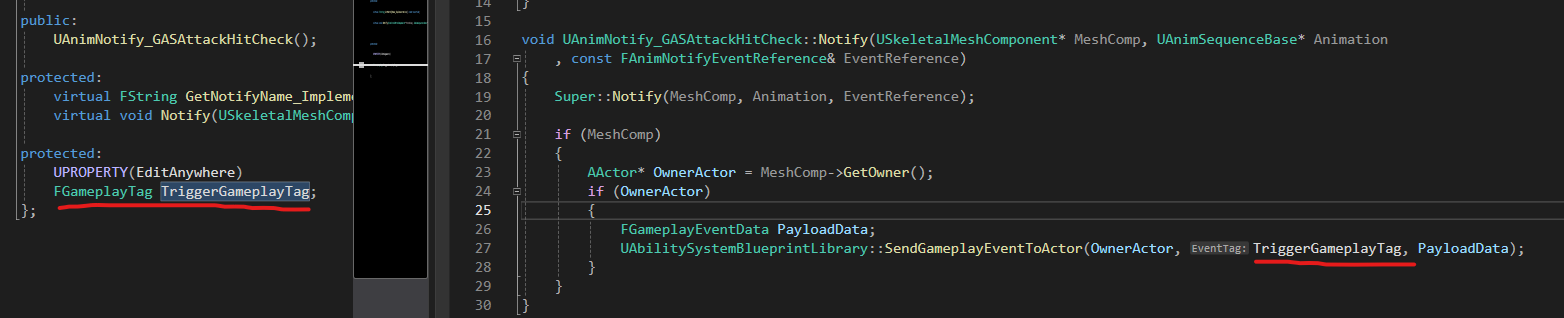 UAnimNotify_GASAttackHitCheck::Notify 내부에서 UAbilitySystemBlueprintLibrary::SendGameplayEventToActor 호출