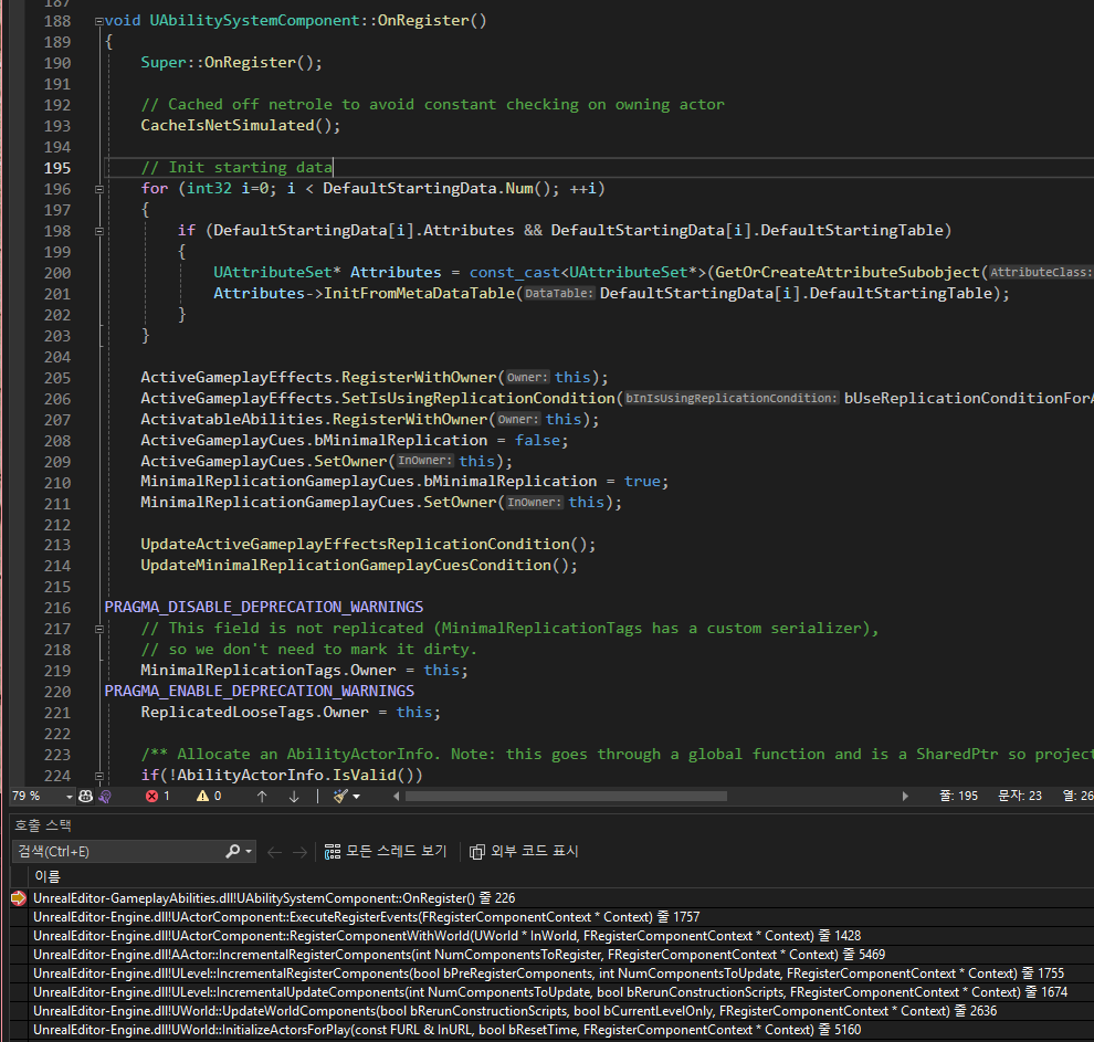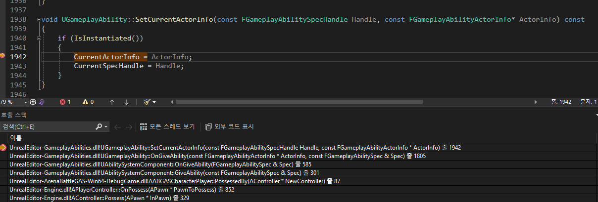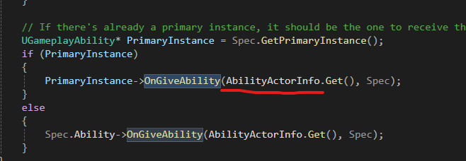 코드를 타고 들어가다보면 UAbilitySystemComponent::OnGiveAbility 내에서 각 어빌리티들에게 자신이 갖고 있는 AbilityActorInfo를 넘겨준다.