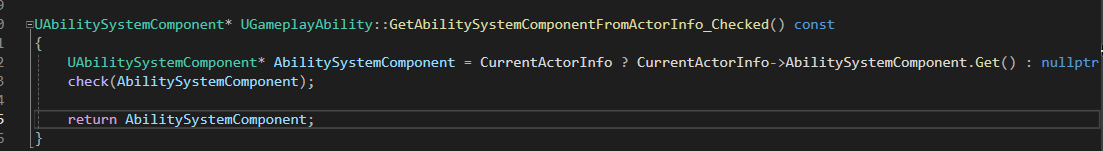 GetAbilitySystemComponentFromActorInfo_Checked() 함수는 CurrentActorInfo를 통해 AbilitySystemComponent에 접근할 수 있다.