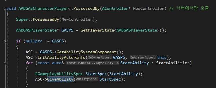 게임 시작 직후에 Player가 빙의될 때, AbilitySystemComponent가 블프로 세팅한 각 어빌리티들에 대해 GiveAbility를 호출해주고 있다. 이때 FGameplayAbilitySpec타입의 FGameplayAbilitySpec을 전달해준다