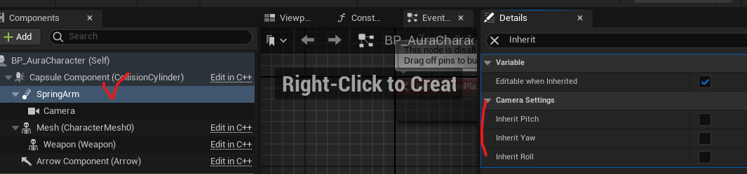 Spring Arm, Camera 두 컴포넌트 모두에 Use Pawn Control Rotation 옵션이 있다.