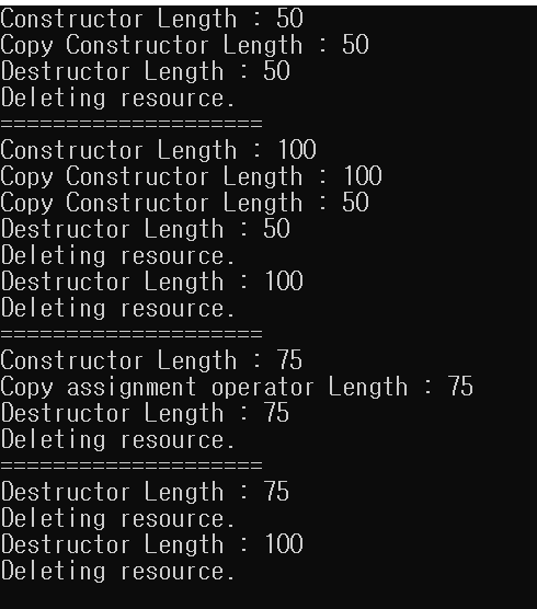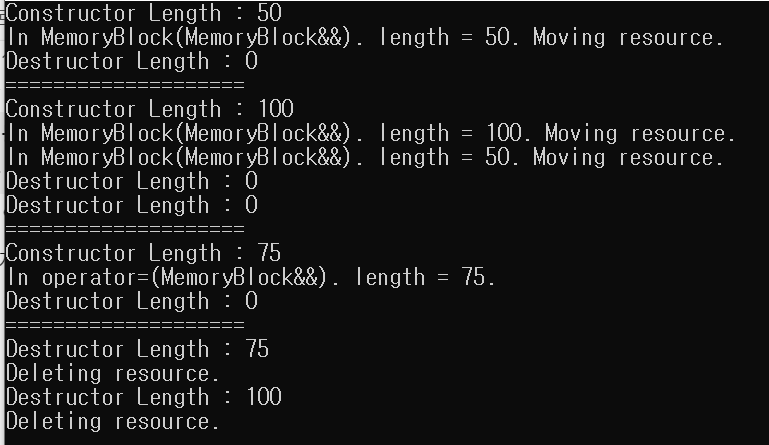 첫번째로 눈에 띄는 점은 복사생성자가 아니라 Move 생성자가 호출되었다는 점이다. 기본적으로 복사 생성자보다 move 생성자가 더 빠르다. 그리고 소멸자가 호출되어도 delete가 호출되지 않은 점을 확인할 수 있다. 생성자에서 만든 객체의 _data 포인터 자체와 _length를 전달해주고 자기 자신은 NULL을 할당한다. copy가 아니라 마치 자기가 갖고 있는걸 주는거기 때문에 소멸자에서 delete하지 않는다.