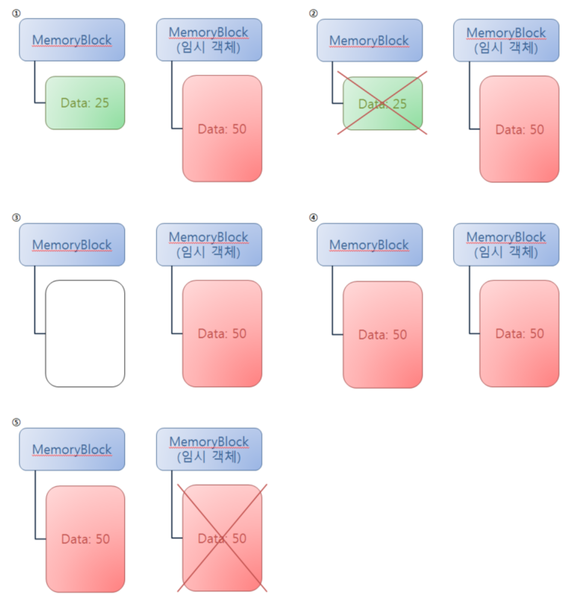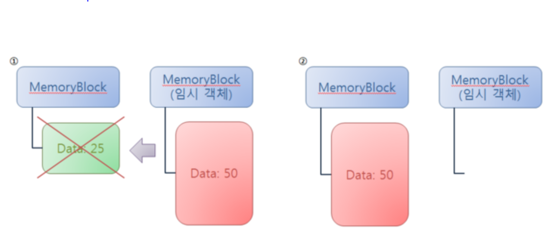 아래 사진은 0번 index에 MemoryBlock(25)가 원래 존재하고 거기에 MemoryBlock(50)을 대입하는 과정을 Move연산자가 없을때와 있을때를 비교한 그림인데 보면 이해가 더 쉽다.