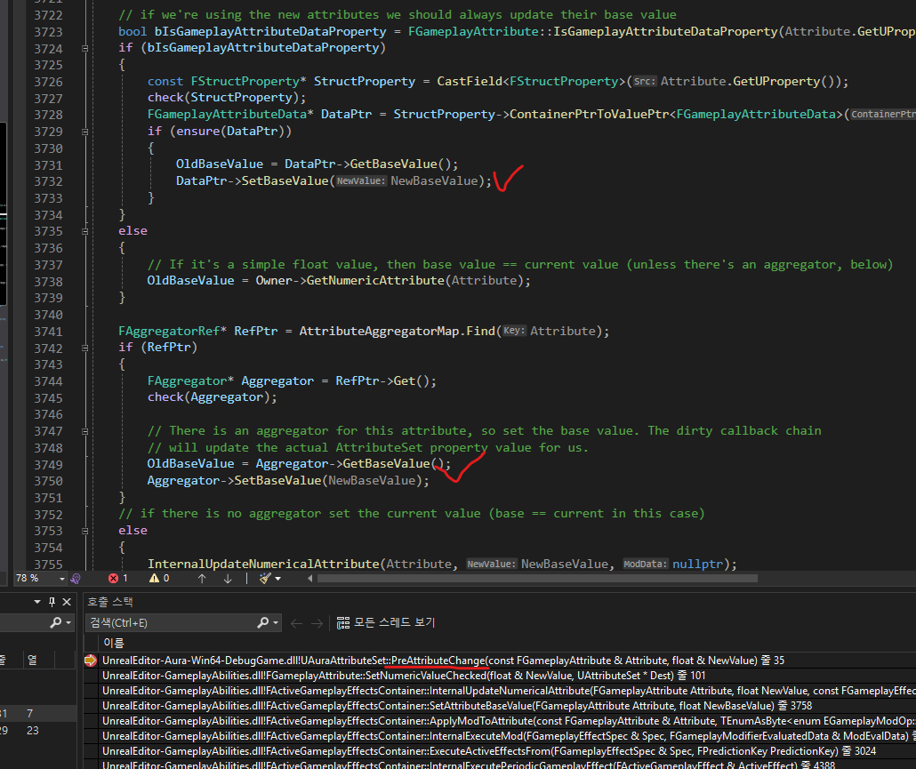 진짜로 PreAttributeChange 이전 콜스택에 FActiveGameplayEffectsContainer::SetAttributeBaseValue 함수 내부에서 BaseValue를 먼저 세팅한 후에 PreAttributeChange를 호출해주고 있었다.