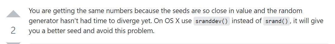 srand함수와 time함수를 사용해서 seed값을 전달한 바로 뒤 첫번째 rand는 완전한 난수가 아닌 듯 보인다. 사용해보면 일정한 값에서 조금씩 증가하기만 할 뿐 완전한 난수가 아니다. 그 이유는 stackoverflow에서 찾을 수 있었다.