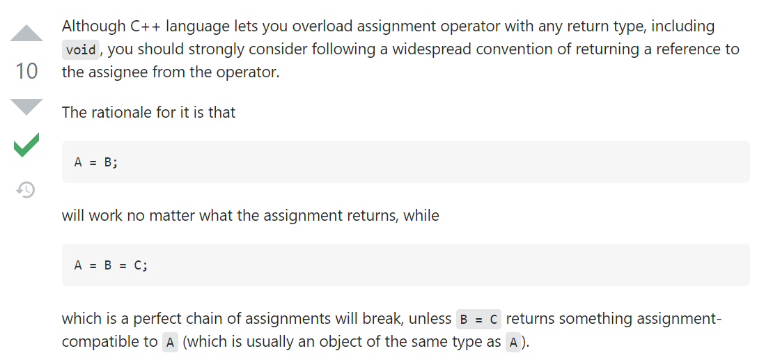결론부터 이야기하면 void 리턴타입으로 대입 연산자를 만드는게 가능은 하지만, 그렇게 하면 A = B = C같은 chain of assignment가 안되기 때문에 객체를 리턴해야 하는 것이다. B = C를 하고 객체를 리턴해야 그 객체를 다시 A에 할당해줄 수 있을 것이다.