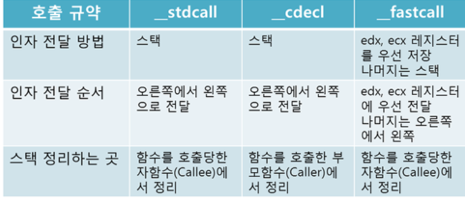 1. 함수 호출 규약 개요 함수 호출 규약(Calling Convention)이란, 함수를 호출하는 방식에 대한 약속이다. 함수 호출 규약은 인자 전달 방법, 인자 전달 순서, Stack Frame을 정리하는 방법에 따라 그 종