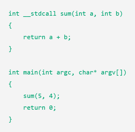 해석하면 그냥 x86 아키텍쳐의 C 컴파일러에서 사용되는 calling convention이라는 의미이다. __stdcall과 마찬가지로 스택을 통해 인자를 전달하고 오른쪽에서 왼쪽으로 인자를 전달한다. 하지만 다른점은 caller가 스택을 정리해준다. 진짜 그런지 위의 소스 코드에서 __stdcall을 지우고 컴파일하고 확인해보자.