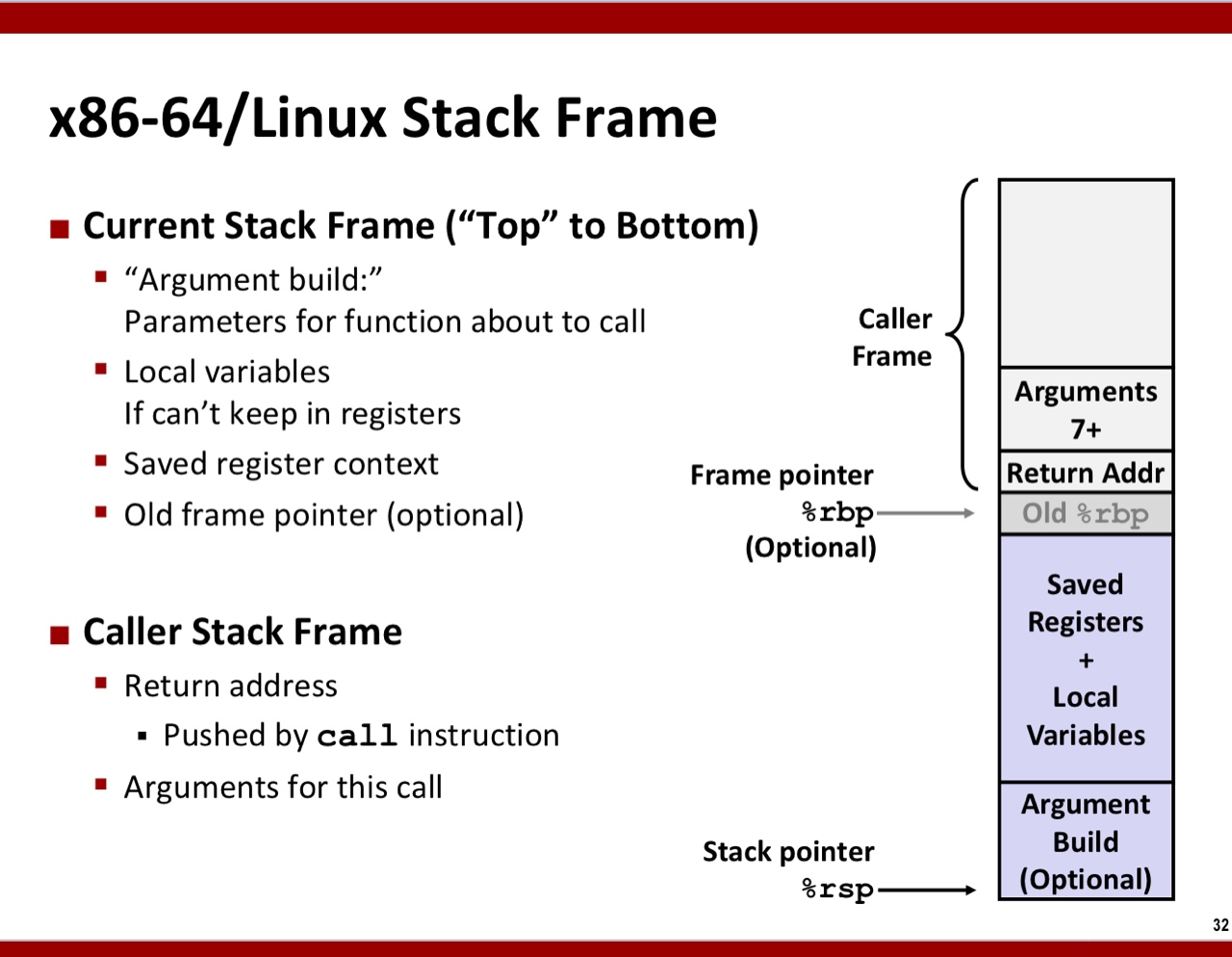 그리고 스택 프레임이란 용어도 알아야 한다. caller와 callee가 있으면 callee의 스택 프레임은 caller가 callee를 위해 stack에 push해주는 인자와 return address를 제외하고 callee함수 내부에서 생긴 지역 변수나, callee가 호출하는 또 다른 제 3의함수를 위한 인자들까지를 의미한다(사실 caller가 스택에 push해주는 callee를 위한 인자나 return address도 callee의 stack으로 포함한다는 글도 몇개 봤는데 두번째 사진은 학부생 수업시간에 쓰던 carnegie mellon university의 lecture자료이니 아마 저게 맞지 않을까 싶다...)