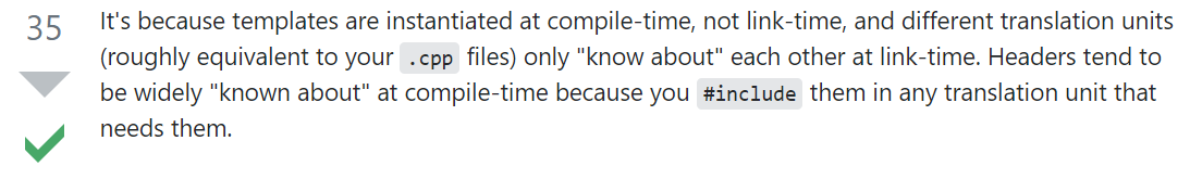 해석하면 template 클래스(혹은 함수)는 컴파일 타임에 인스턴스화되는데(링크 타임이 아니라), cpp파일은 link-time에 다른 cpp파일들을 인지할 수 있다. 헤더파일은 #include 덕분에 컴파일타임에 알려지게 된다. 그래서 헤더파일에 선언과 구현이 모두 있어야 하는것이다.
