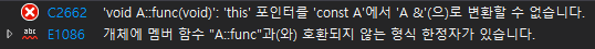 에러에 관한 이야기를 하기 전에 짚고 넘어 가야 할 중요한 사실이 있는데 C++에서 const를 요구하는 인자에 non-const를 넘기는 것은 괜찮지만 non-const를 요구하는 곳에 const를 쓰면 에러가 생긴다(https://erlerobotics.gitbooks.io/erle-robotics-cpp-gitbook/content/advanced_topics_i/const_and_non-const.html)