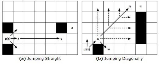 Figure(a)가 Jumping Straight Case이다. p(x)는 x의 부모이다. p(x) 기준으로 상하좌우 중에서 오른쪽으로만 갈 수 있으니 오른쪽으로 쭉 간다. 이때 쭉 가면서 진행 방향의 왼쪽(또는 오른쪽)이 막혀있고 왼쪽 대각선 방향(혹은 오른쪽 대각선 방향) 이 갈 수 있는 곳이라면 그곳은 새로운 Jump Point가 될 수 있다. Figure(a)가 정확히 이 예시이므로 y가 새로운 Jumping Point가 될 수 있다. 참고로 Figure(a)의 양쪽 대각선 화살표 방향의 타일도 Figure(b)의 Jumping Diagonally Case에 의해 새로운 Jumping Point가 될 수 있다.