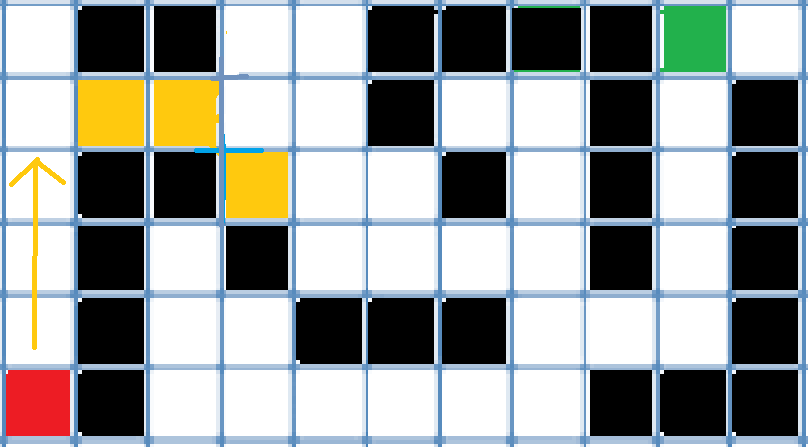 시작점에서 위로 쭉 가다가 오른쪽이 막히고, 오른쪽 대각선이 갈 수 있는 곳이므로 노란 타일은 새로운 Jump Point가 될 수 있다. 노란색 타일에서 갈 수 있는 곳은 오른쪽이므로 오른쪽으로 한칸씩 가면서 Jumping Straight Case인지를 검사하면 바로 오른쪽 타일이 새로운 Jump Point인 것을 알 수 있다.